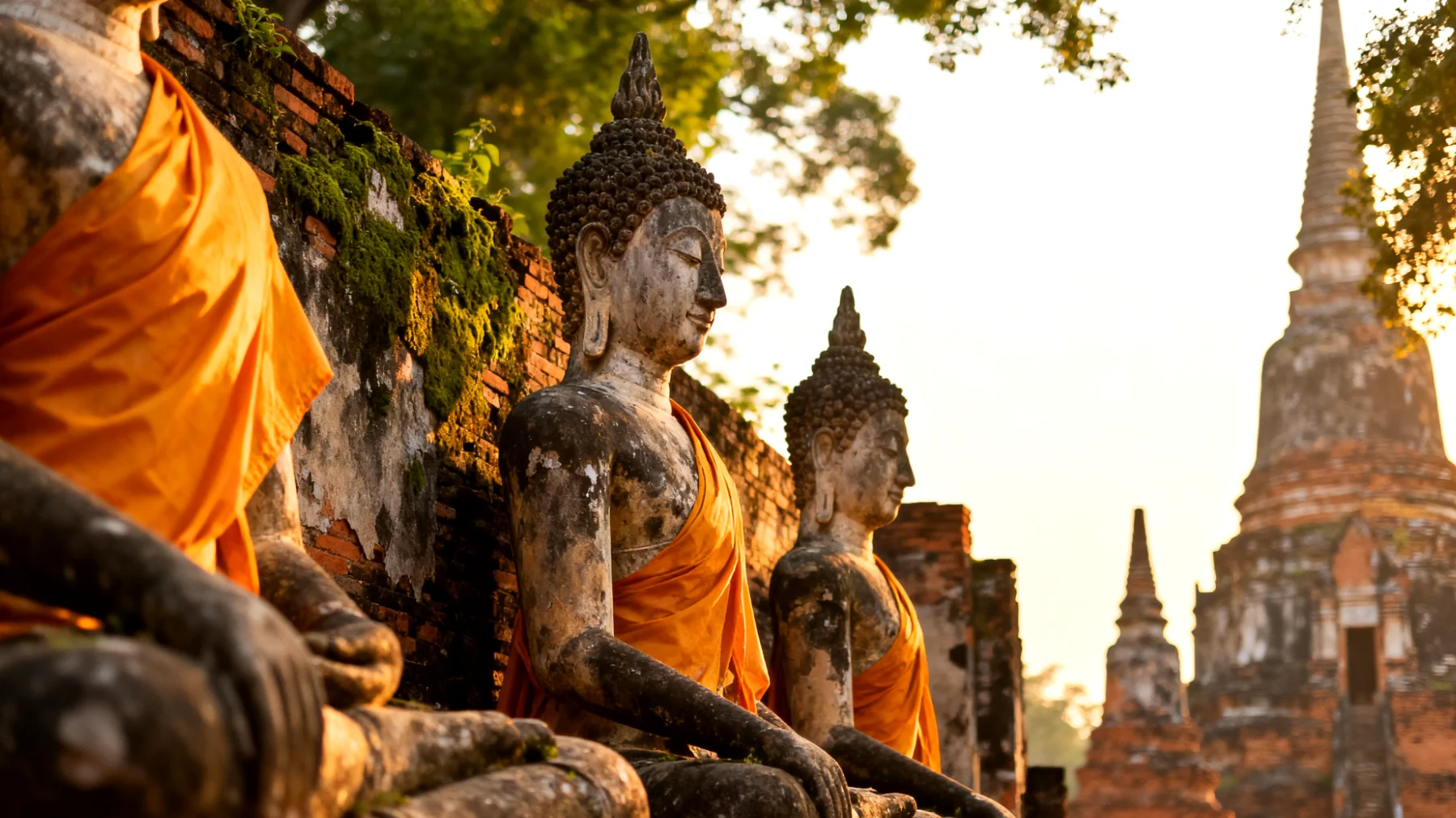 Das Besondere an Ayutthaya ist die schiere Anzahl und Vielfalt der Ruinen. Über 400 Tempelanlagen verteilen sich auf einer Insel, die von drei Flüssen umschlossen wird. Jeder Tempel hat seinen eigenen Charakter: Manche türmen sich als imposante Prangs in den Himmel, andere liegen halb verborgen unter Wurzeln jahrhundertealter Bäume. Der berühmteste Anblick ist zweifellos der steinerne Buddha-Kopf, der vollständig von den Wurzeln eines Banyan-Baums umschlossen wurde – ein Symbol für die Kraft der Natur und den Lauf der Zeit.